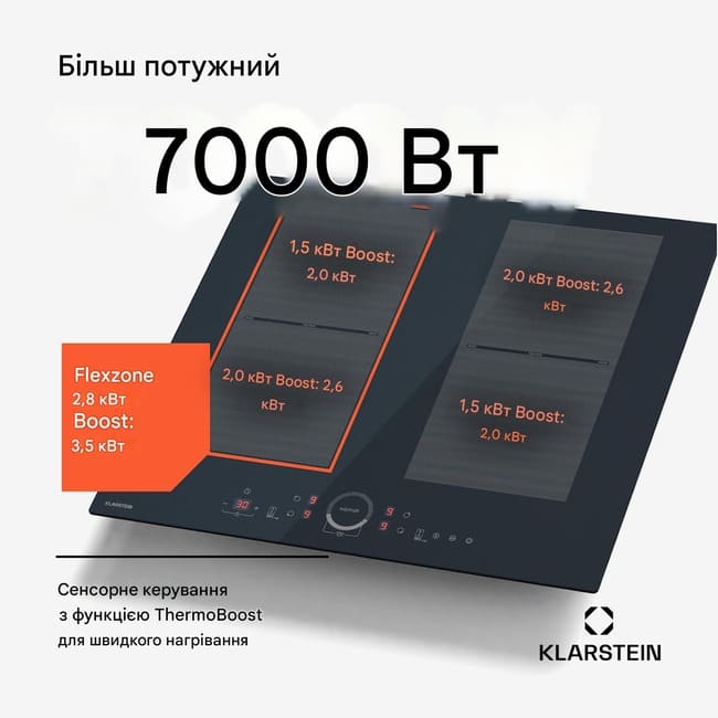 - Вихідна потужність правої гнучкої зони: 2800 Вт (Boost: 3500 Вт)