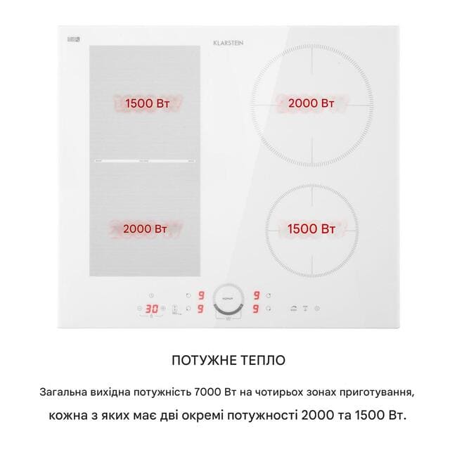 Вбудована варильна панель Klarstein Delicatessa 60 Hybrid пропонує чотири варильні поверхні для насолоди загальною потужністю до 7000 Вт, які розподіляються між окремими варочними поверхнями на 2 x 2000 та 2 x 1500 Вт і приносять вміст каструль та сковорідок. до кипіння на годину пік.