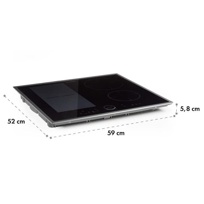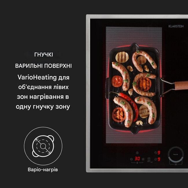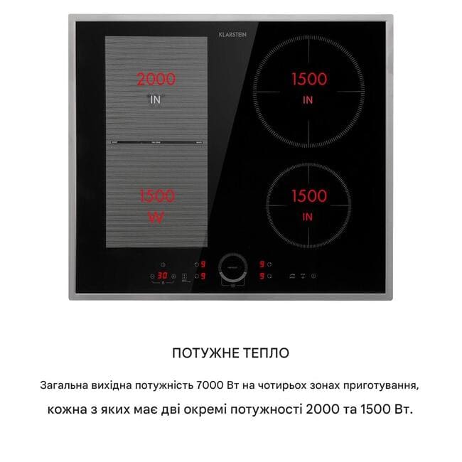 Вбудована варильна панель Klarstein Delicatessa 60 Hybrid Prime пропонує чотири варильні поверхні для насолоди із загальною потужністю до 7000 Вт, які розподіляються між окремими варильними поверхнями 2 x 2000 Вт і 2 x 1500 Вт. Дві ліві зони нагрівання об’єднуються, щоб утворити гнучку зону за допомогою VarioHeating : з максимальною гнучкістю вона адаптується до розміру каструль, сковорідок або каструль, розміщених на ній, завдяки розпізнаванню каструлі, і таким чином також нагріває великий посуд, який не поміщається окремо плита. З одного боку, Delicatessa 60 Hybrid Prime використовує лише ту енергію, яка відповідає каструлі, а з іншого боку, вона дозволяє використовувати майже будь-який розмір каструлі чи сковорідки. Потужність усіх полів можна регулювати окремо та має функцію ThermoBoost , яка збільшує потужність до 2800 Вт для швидкого нагріву. Склокерамічною варильною поверхнею Klarstein Delicatessa 60 Hybrid Prime легко керувати завдяки вбудованій сенсорній панелі SenseControl із сенсорним контролером для керування потужністю та цифровим дисплеєм. Це означає, що ані кнопки, ані елементи керування не пробиваються крізь поверхню кухонного гарнітура. Окрім потужності, для кожної конфорки можна запрограмувати таймер до 99 хвилин, який або вимикає плиту після закінчення встановленого часу, або дає звуковий сигнал.