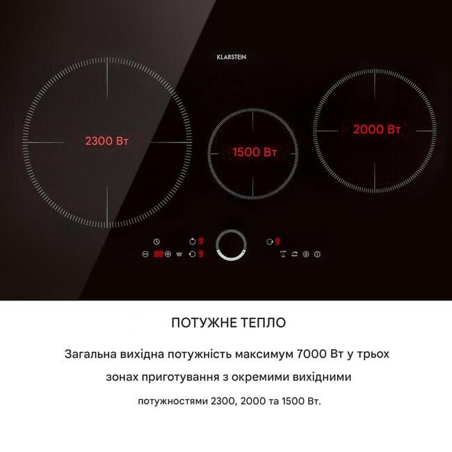 - Загальна потужність: макс. 7400 Вт (2300 Вт, 2000 Вт і 1500 Вт)