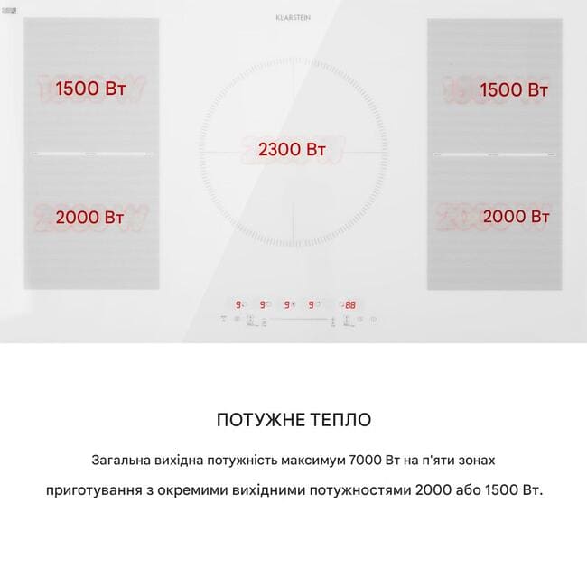 Потужне нагрівання: загальна потужність макс. 7400 Вт у п’яти зонах нагрівання з окремою потужністю 2300, 2000 або 1500 Вт.