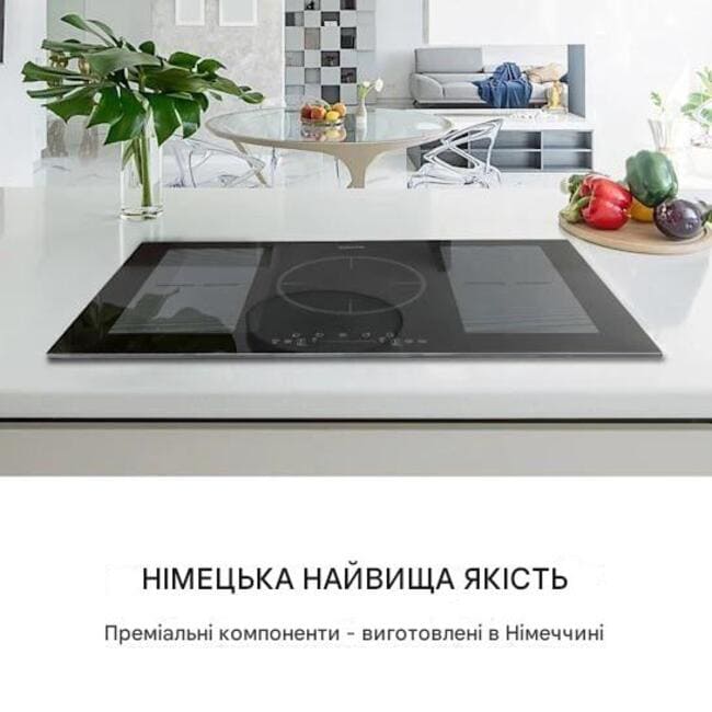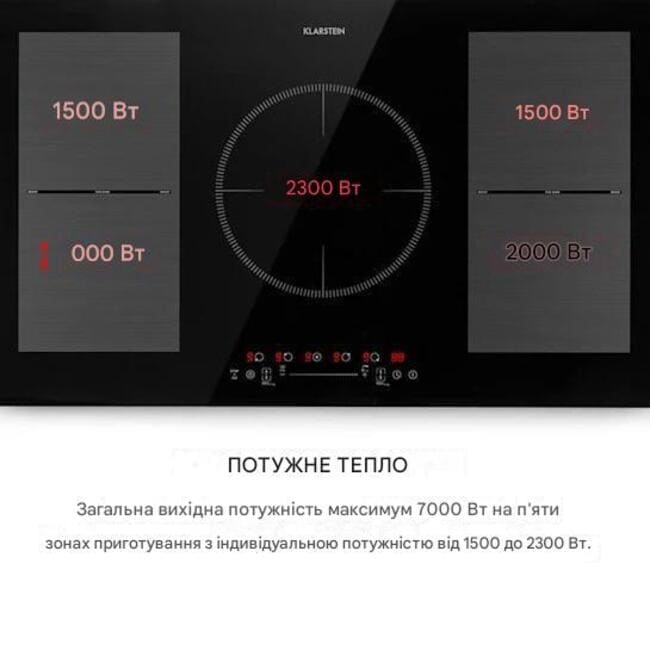 - Потужне нагрівання: загальна потужність макс. 7000 Вт у п'яти конфорках з індивідуальною потужністю 2000 або 1500 Вт