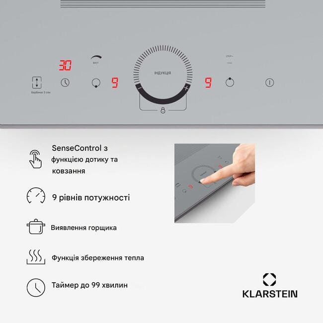 - Чітка робота: склокерамічна поверхня з сенсорною сенсорною панеллю керування та маркуванням варильної поверхні