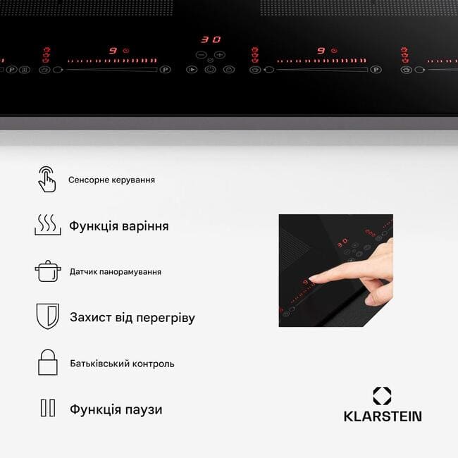 Гладку склокерамічну поверхню легко чистити. Функції безпеки, такі як захист від перегріву та автоматичне вимкнення, гарантують безпеку. Функція повільного кипіння дозволяє безперервно готувати за низьких температур, що ідеально підходить для тушкування або плавлення. Завдяки потужності 7200 Вт і функції boost, сенсорна панель керування із слайдером забезпечує точний контроль температури.
