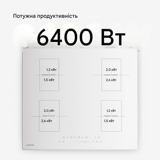 - Конфорка 1: 18 см, 2000 Вт (з підсиленням: 2600 Вт)