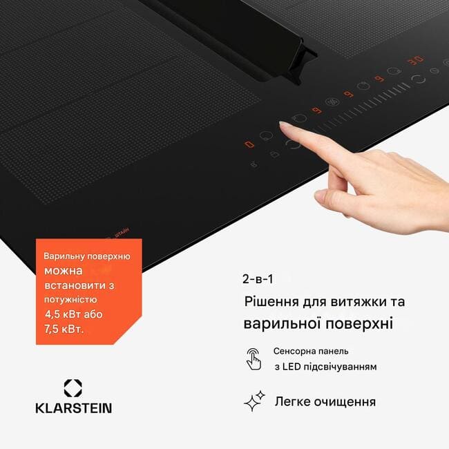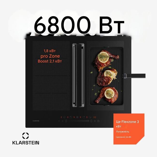 Завдяки системі Klarstein Chef-Fusion DownAir ви відчуєте ідеальний симбіоз витяжки та індукційної варильної панелі, тому купувати окрему витяжку не потрібно. Ця індукційна плита з витяжкою не тільки надає вашій кухні бездоганний вигляд, але й створює додатковий простір для зберігання, оскільки не потрібні додаткові навісні шафи над зоною готування. Потужний двигун постійного струму гарантує вражаючу потужність всмоктування 600 м³/год і високу енергоефективність (A). Індукційна варильна поверхня з вентиляцією потужністю 6400 Вт (навіть 8400 Вт із функцією посилення) і гнучка зона забезпечують максимальну гнучкість під час приготування їжі. Компактний дизайн також дозволяє збільшити корисний простір у ящиках або шафах під плитою. Естетичний дизайн із центральною заслінкою, яка приховує повітрозабірну частину витяжки, гармонійно вписується в робочу поверхню вашої кухні та створює сучасний зовнішній вигляд.