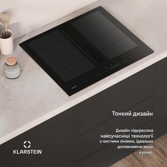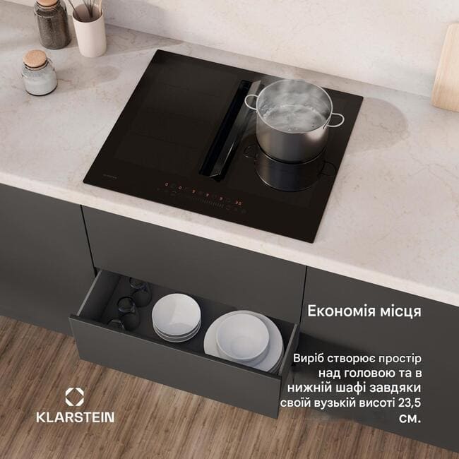 Надихніться поєднанням передових технологій і привабливого дизайну з системою Klarstein Chef-Fusion DownAir – для ефективного, компактного та естетичного кухонного рішення.