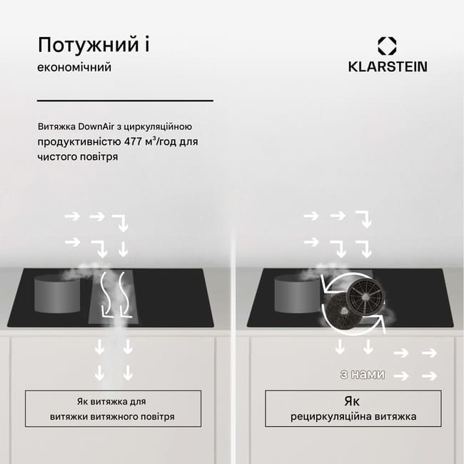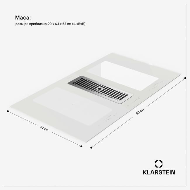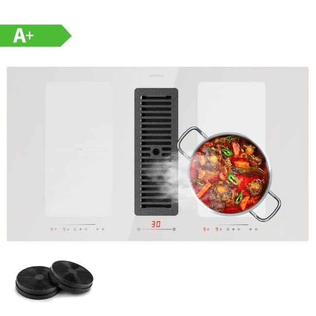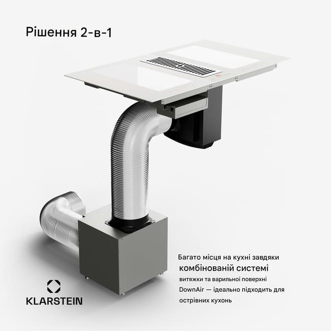 Система відводу DownAir є безпосередньо частиною варильної поверхні та відводить пару та кухонні випари безпосередньо вниз із продуктивністю відведення 477 м³/год. Над головою немає нічого, що блокувало б доступ до каструль і сковорідок, що робить систему чудовою, особливо для кухонних островів. Варильною поверхнею та системою витяжки можна керувати за допомогою сенсорної панелі управління SenseControl з підсвіченими повзунками. Жодна кнопка не проривається крізь бездоганну склокерамічну поверхню повної системи Klarstein Full House 90 .