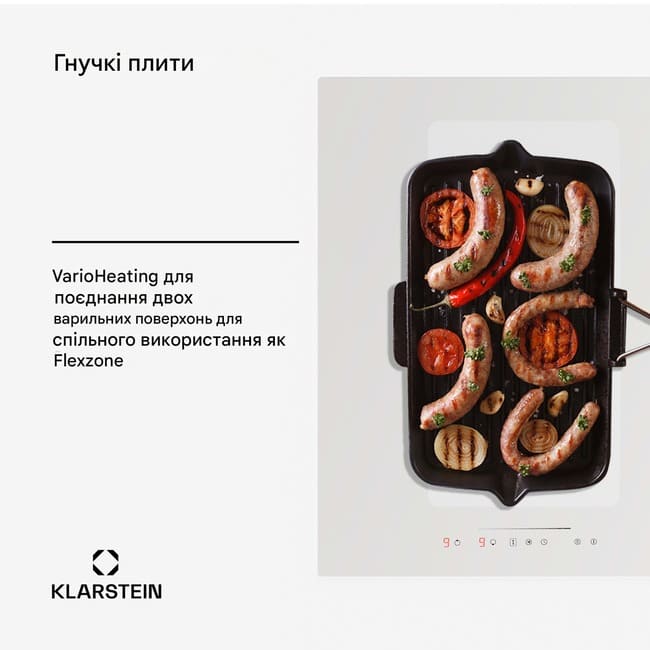 Індукційна варильна поверхня Klarstein Full House 90 має чотири зони приготування, ліворуч і праворуч від вбудованої витяжки . Дві конфорки завжди можна об’єднати в гнучку зону, щоб можна було забезпечити необхідний простір навіть для дуже великих каструль і сковорідок. Кожна варильна поверхня може бути встановлена на 9 рівнів і має функцію ThermoBoost для збільшення потужності для блискавичного приготування їжі. Розпізнавання каструлі, функція Stop & Go з ThermalRecall, виявлення залишкового тепла, блокування від дітей і функція підтримки тепла доповнюють діапазон використання варильної поверхні.