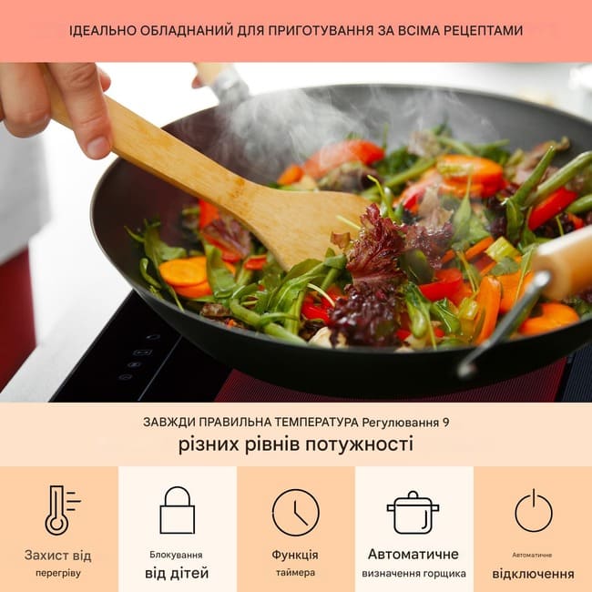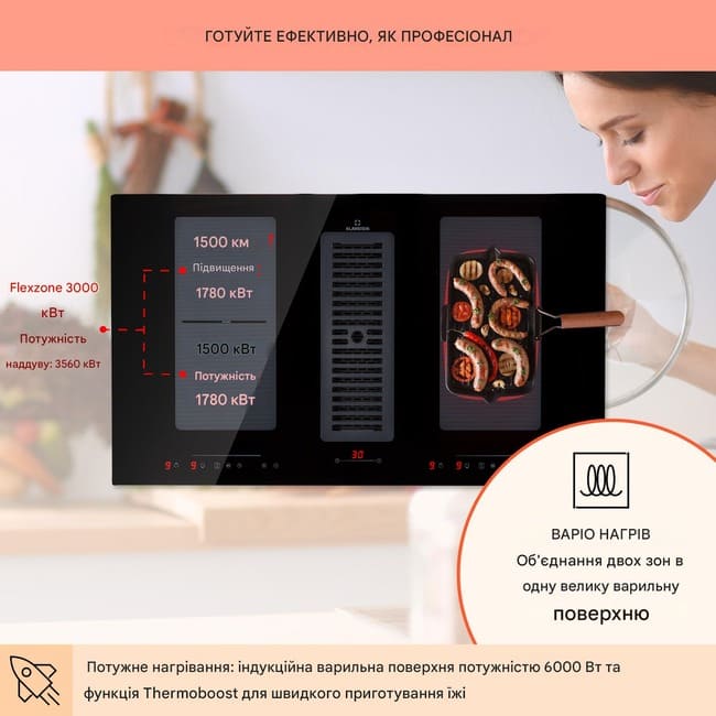 Індукційна плита Klarstein Full House має чотири конфорки, вбудовану витяжку DownAir ліворуч і праворуч . Дві конфорки можна поєднати, щоб утворити гнучку зону, щоб навіть великі каструлі та сковорідки мали необхідний простір. Кожна конфорка може бути налаштована на 9 рівнів і має функцію ThermoBoost для збільшення потужності для блискавичного кипіння. Виявлення каструлі, функція зупинки та виходу з ThermalRecall , виявлення залишкового тепла, блокування від дітей і функція підтримки тепла завершують діапазон використання варильної поверхні.