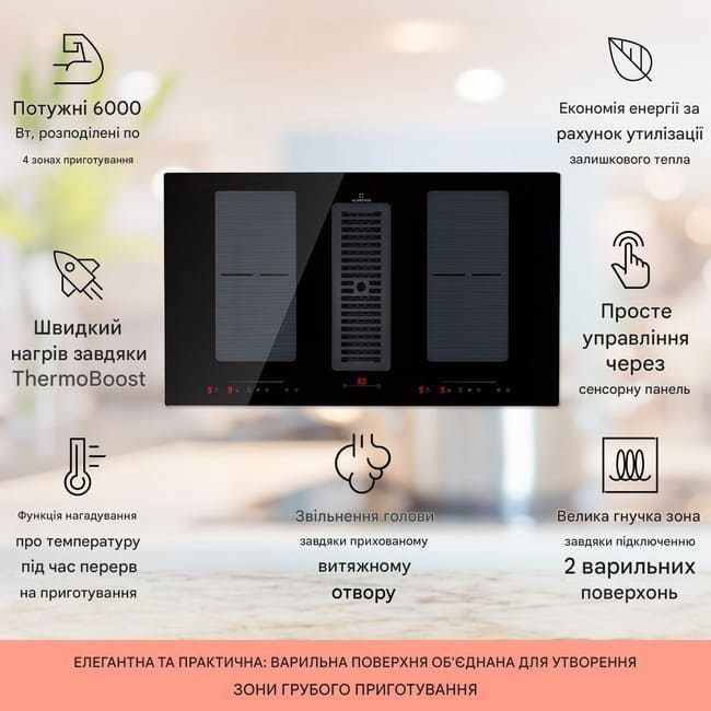 Прямо посередині, а не просто там: Klarstein Full House DownAir System революціонізує вашу кухню! Він поєднує свою індукційну плиту безпосередньо з витяжкою DownAir . Це означає, що кухонна пара та запахи зникають безпосередньо там, де вони виникають.
