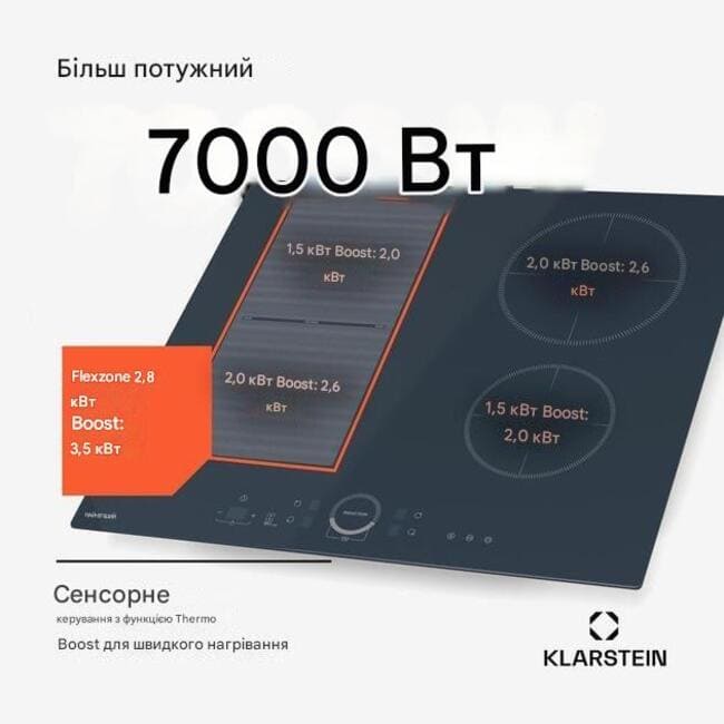 - Загальна потужність: 7000 Вт (2 x 2000 Вт та 2 x 1500 Вт)
