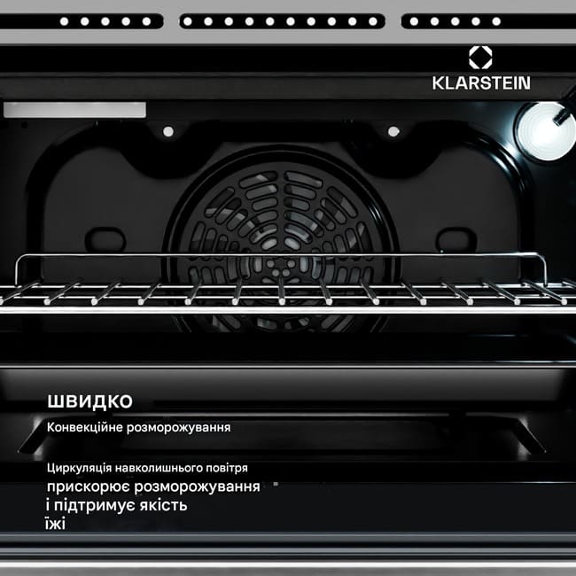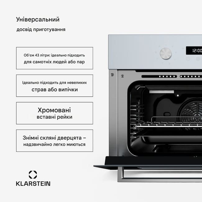 Вбудована духовка Klarstein SpaceSmart вражає своїм компактним дизайном, пропонуючи ту ж функціональність, що й звичайні духовки діаметром 60 см. Оснащена вісьмома функціями, вона ідеально вписується в будь-яку кухню та легко миється.