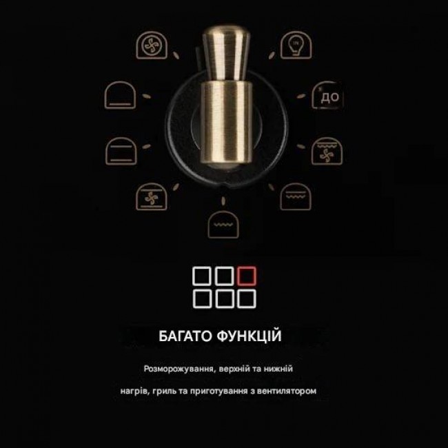 - 9 функцій: лампа духовки, розморожування, нижній нагрів, верхній і нижній нагрівання, верхній і нижній нагрівання з вентилятором, одинарний гриль, подвійний гриль, подвійний гриль з вентилятором і циркуляцією повітря