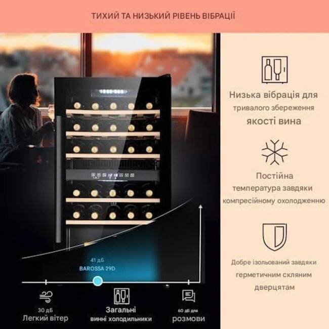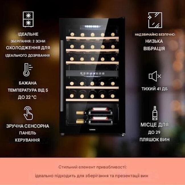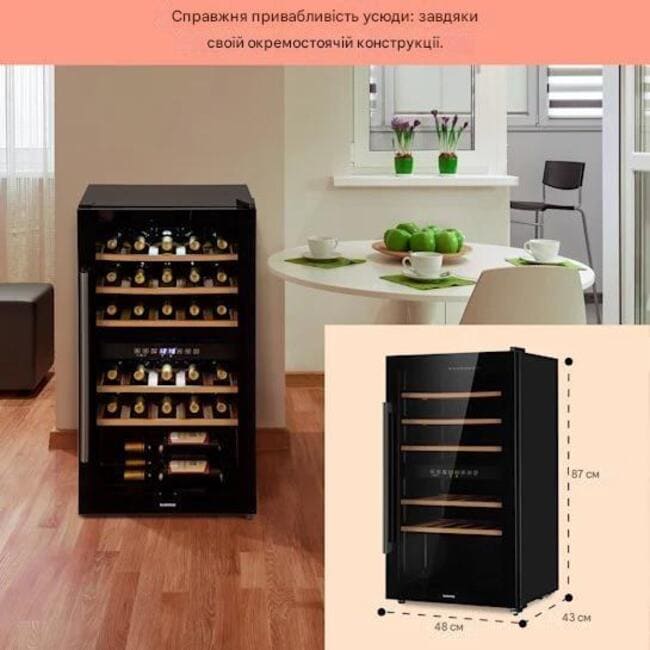 - Місткість (пляшки): 29 (стандартні пляшки 0,75 л висотою 31 см)