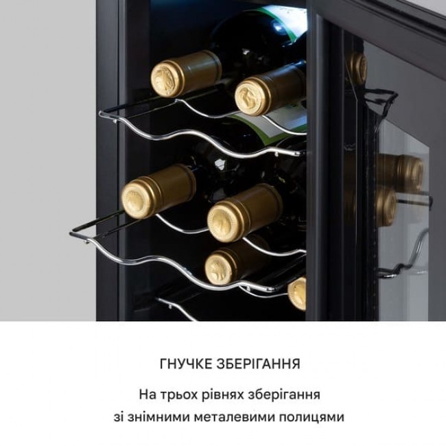 Вишукане червоне вино, біле ігристе або свіже рожеве: стильна шафа для зберігання вина Bellevin 6 Uno зберігає до 6 пляшок оптимально охолодженими в 17-літровій одній зоні охолодження. Усі пляшки чудово розміщуються на трьох рівнях зберігання з висувними металевими полицями. Ви можете встановити температуру від 11 до 18 °C за допомогою сенсорної панелі керування та рідкокристалічного дисплея на зовнішній стороні дверцят. Перемикається яскраво-біла світлодіодна лампа всередині забезпечує необхідний огляд і надає найкраще освітлення вмісту винного холодильника.