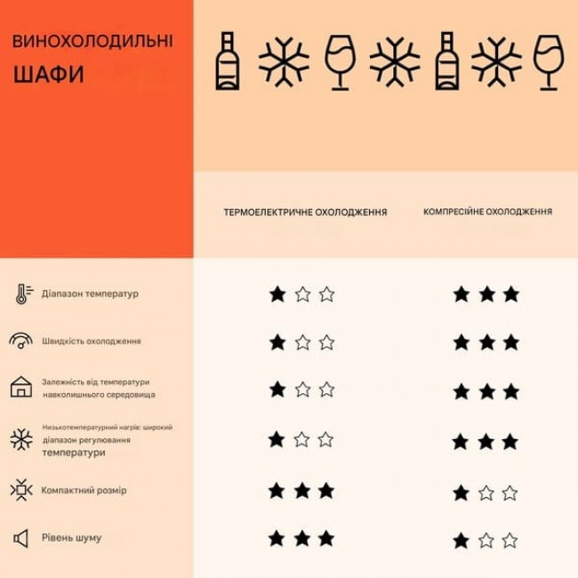- Температура верхньої зони охолодження: від 5 до 12 °C (ідеально підходить для білих і рожевих вин, ігристого вина, пива або безалкогольних напоїв)