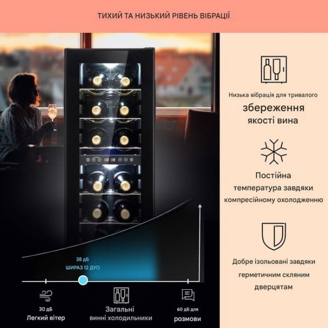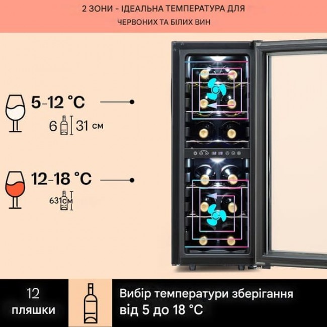 - Температура нижньої зони охолодження: від 12 до 18 °C (ідеально підходить для рожевих і червоних вин і менш охолоджених безалкогольних напоїв)