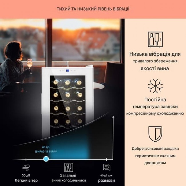 Для любителів вина: Холодильник Klarstein Shiraz 15 Slim Uno забезпечує найкращу насолоду вином, забезпечуючи пляшкам потрібну температуру для пиття. У той же час він відрізняється своїм тонким дизайном і чудово вписується в невеликі приміщення. Він забезпечує найкращі умови зберігання марочних вин і надійно охолоджує їх до 5-18°C. Завдяки переднім дверцятам із безпечного скла шафа для зберігання вина дозволяє вишукано піднести ваші винні пляшки.