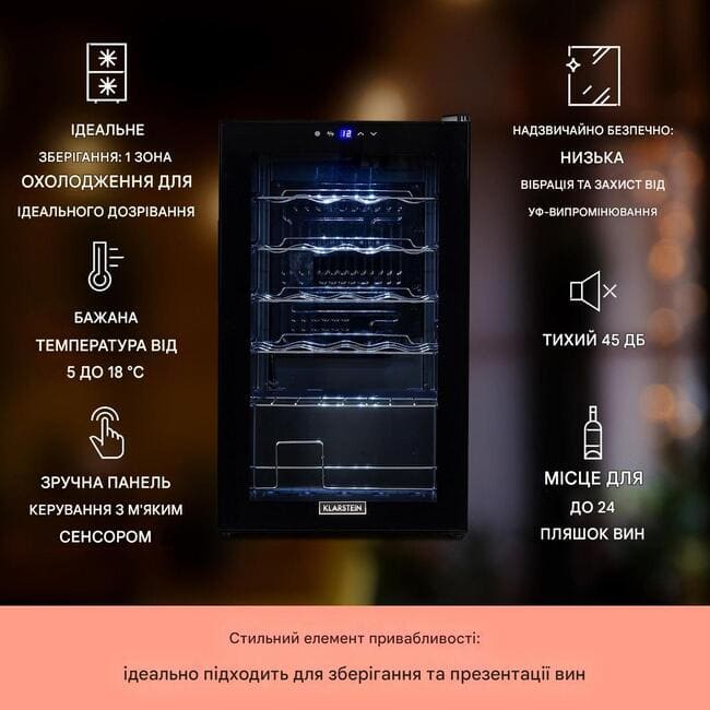 Заради справжньої любові до вина винний холодильник Klarstein Shiraz 24 Slim Uno забезпечує професійні умови зберігання вашої колекції. Компактний і стильний дизайн дозволяє легко розмістити пристрій навіть у невеликих приміщеннях, зберігаючи максимальну функціональність.