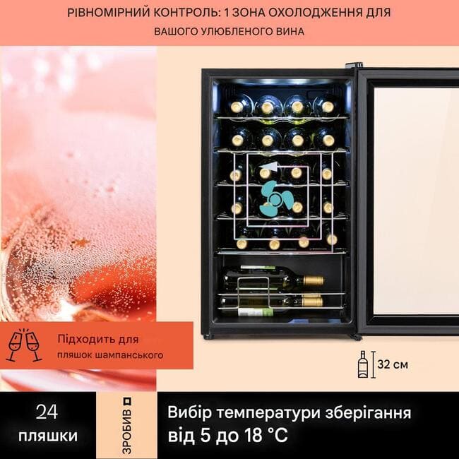 Холодильник вміщує до 24 пляшок і підтримує оптимальний температурний режим від 5 до 18 °C, що ідеально підходить для зберігання червоних, білих і ігристих вин. Скляні дверцята з захисним покриттям забезпечують ефектну презентацію вашої винної колекції та захищають її від зовнішніх впливів.