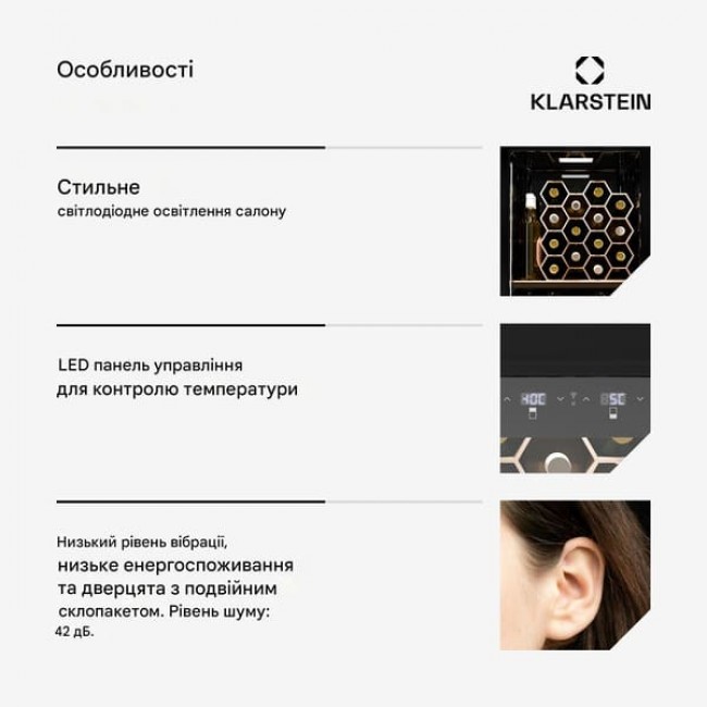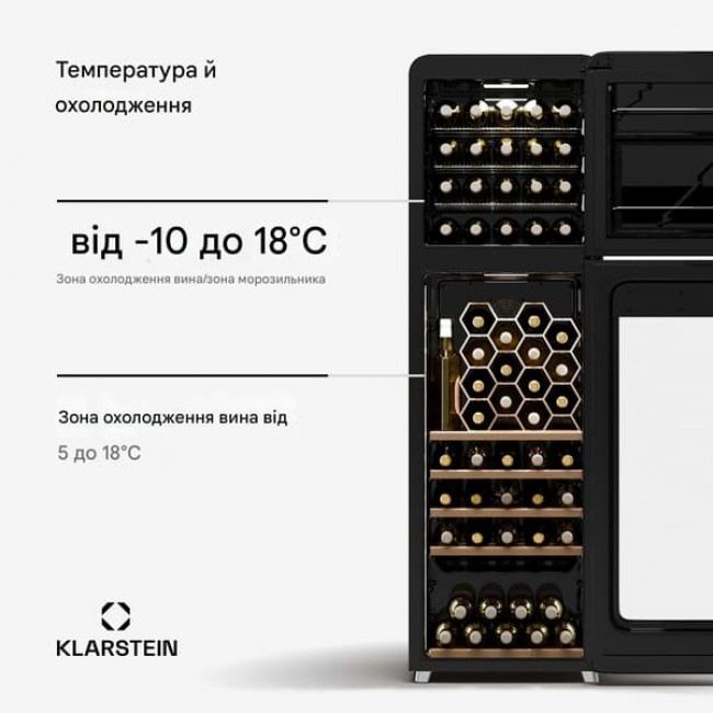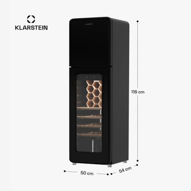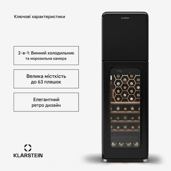 Дизайнерський пристрій вражає своїм високоякісним ретро-виглядом та бездоганно поєднується з будь-яким інтер'єром, одночасно покращуючи інтер'єр кімнати. Просторий інтер'єр винного холодильника Klarstein Shirley пропонує місце для зберігання до 60 пляшок вина, які зберігаються за ідеальної температури для тривалого збереження якості. Двозонна технологія гарантує, що як червоні, так і білі вина можуть зберігатися за їхньої оптимальної температури. Водночас морозильна камера пропонує можливість зручного охолодження або заморожування напоїв чи винних аксесуарів.