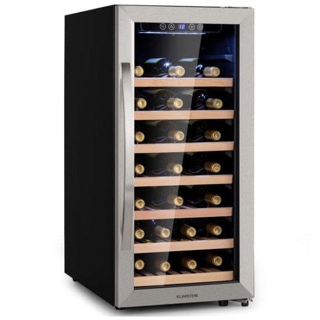Винний холодильник Klarstein Vinamour 38 Uno гарантує найкращу насолоду від вина. Завдяки одній зоні охолодження він зберігає загалом 38 пляшок червоного або білого вина при ідеальній температурі для пиття. Температуру охолодження від 5 до 18°C можна встановити за допомогою сенсорної панелі керування – ідеально для ігристого шампанського. Він створює розкішну атмосферу та презентує вишукані вина унікальним чином. Біле освітлення створює елегантний акцент на винах, що зберігаються, а панорамні скляні дверцята забезпечують ідеальний огляд. Винний холодильник також пропонує можливість оптимального зберігання різних видів вина.