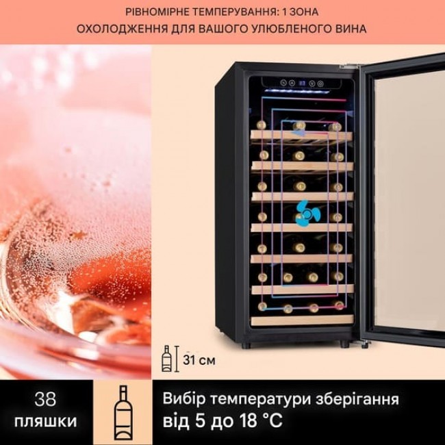 Заради любові до вина: винний холодильник Klarstein Vinamour 38 Uno пропонує стильний простір для зберігання та ідеальне охолодження вина, ігристого вина та інших напоїв.