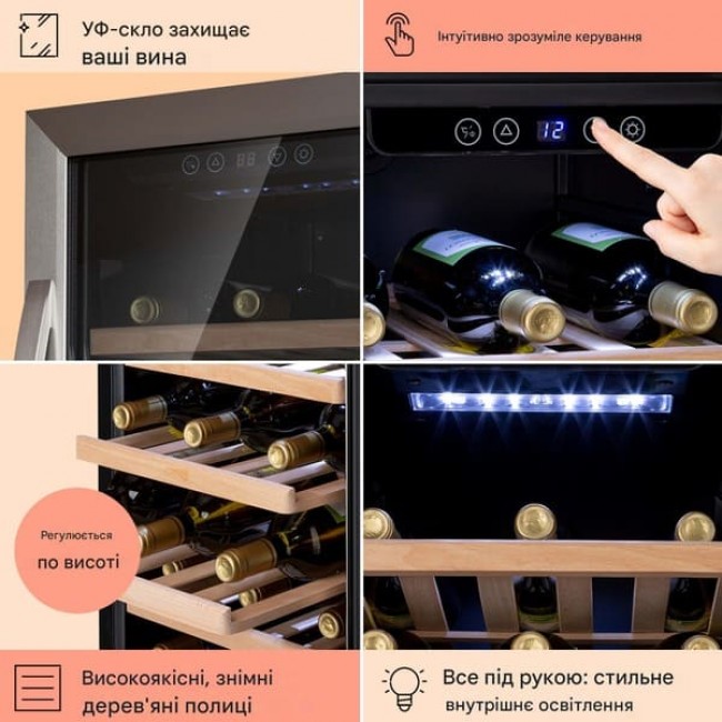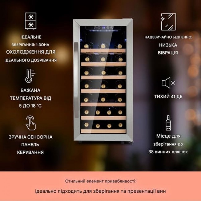 - 94 літри внутрішнього простору: до 38 пляшок вина