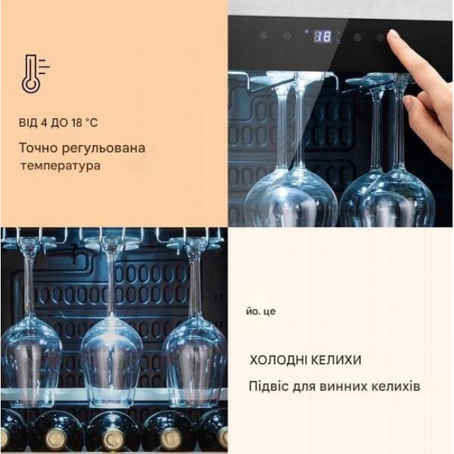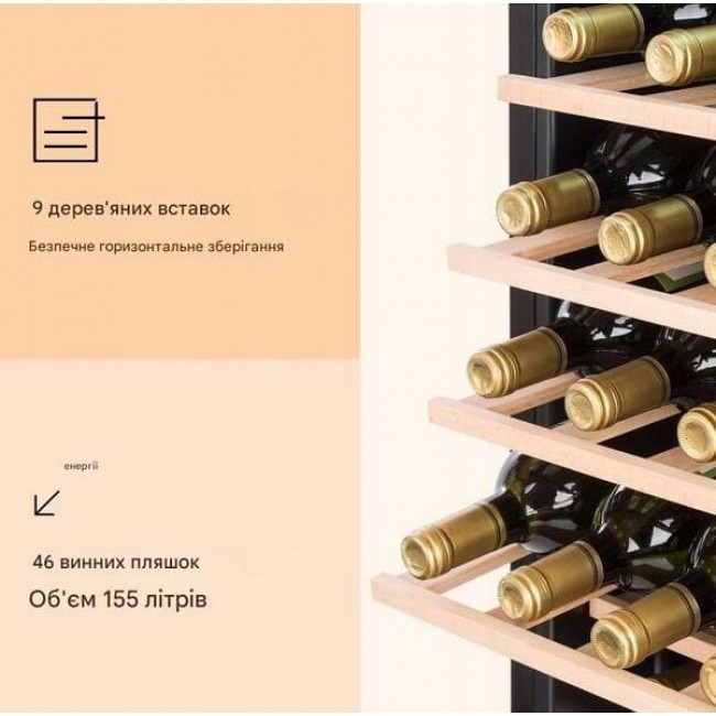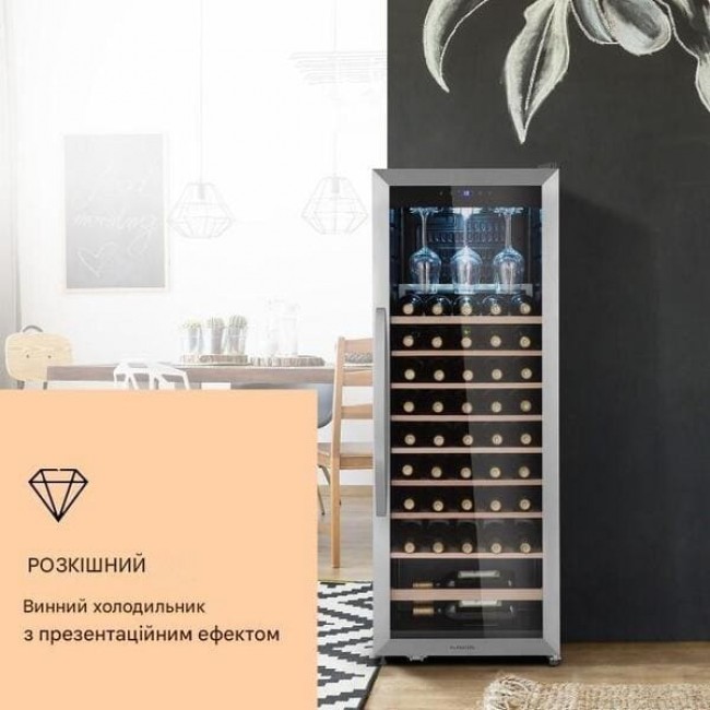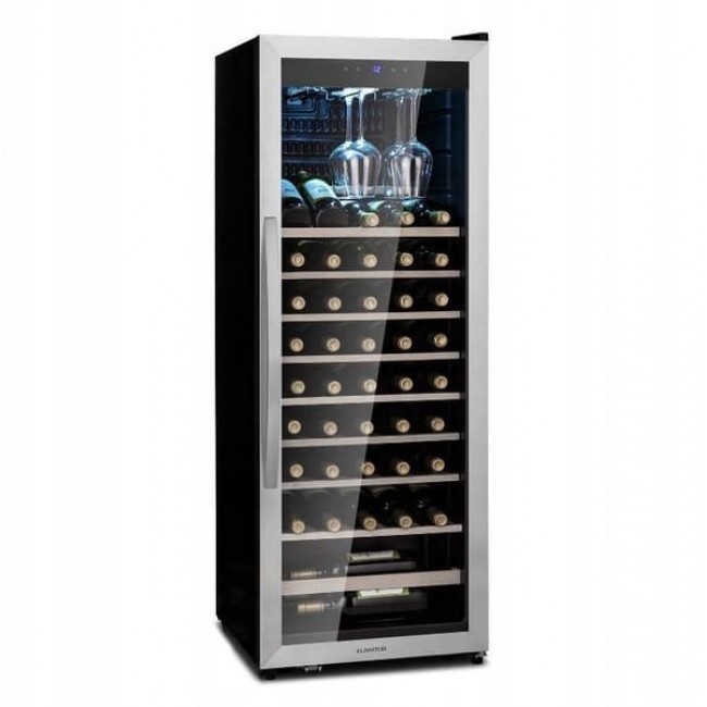 Для любові до вина: винний холодильник Klarstein Vinamour 46 Uno гарантує найкраще задоволення. З об’ємом 155 літрів він вміщує до 46 пляшок вина, розподілених на 10 рівнях і 9 дерев’яних полицях, охолоджуваних до температури від 4 до 18°C. У верхній частині передбачено місце для 6 елегантно підвішених винних келихів. Сенсорне керування зручне та просте. Завдяки внутрішньому підсвічуванню пляшки виглядають розкішно, а скляні дверцята створюють вражаючий візуальний ефект.