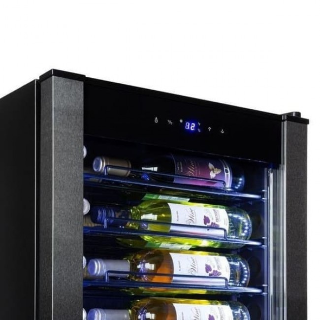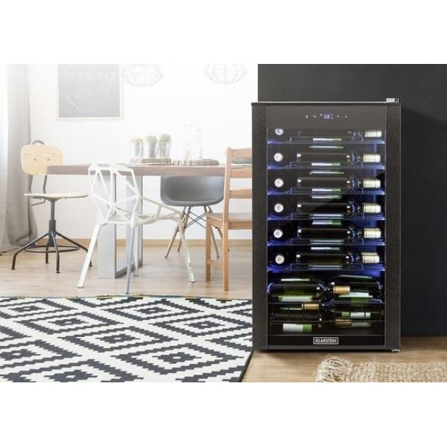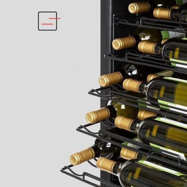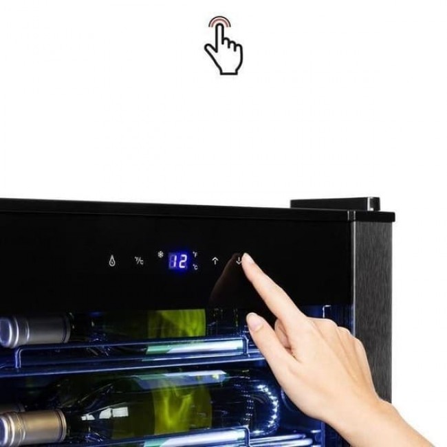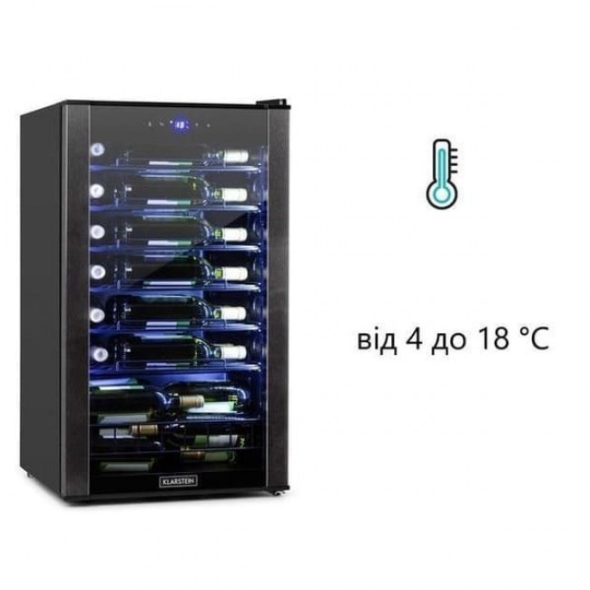 Для любові до вина: винний холодильник Klarstein Vinomatica 36 Uno забезпечує найкращу насолоду від вина, зберігаючи пляшки вина при правильній температурі пиття. Він надає особливого значення вишуканій презентації. Пляшки зберігаються горизонтально на семи рівнях, щоб їх етикетки було добре видно через великі панорамні скляні двері. Ви можете нагріти до 36 пляшок вина до ідеальної температури від 4 до 18 °C в ексклюзивному охолоджувачі вина . Нею дуже легко керувати за допомогою сенсорної панелі керування, яка сама пояснює себе.Привертає увагу всіх і надає вишуканим винам ідеальну температуру для пиття: винний холодильник Vinomatica від Klarstein