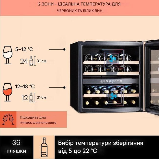 Охолоджуйте та зберігайте червоні та білі вина одночасно: з розкішним винним холодильником Vinsider 36 Onyx Edition від Klarstein.