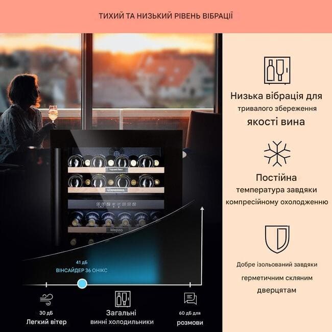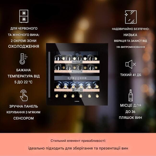 Винний холодильник Vinsider 36 Onyx Edition від Klarstein : Оптимальне зберігання вина гарантує найкраще задоволення від напою! За допомогою елегантного 2-зонного винного холодильника ви можете довести 36 пляшок найкращого вина до ідеальної температури для пиття, зберігати їх протягом тривалого часу та демонструвати. Скляні дверцята з панорамним вікном та полиці з можливістю запису забезпечують хороший огляд, а пляшки оптимально захищені від вібрації та світла. Вбудований винний холодильник ідеально впишеться в будь-яку кухню.