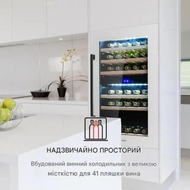 - Надзвичайно просторий: вбудований винний холодильник місткістю 41 пляшка вина.