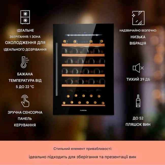Завдяки вбудованому винному холодильнику Klarstein Vinsider 52 Built-In Uno ви можете забезпечити своєму вину ідеальні умови для повного аромату та ідеальної температури вживання. Все, що вам потрібно зробити, це відкрити елегантні передні дверцята з тонованим панорамним вікном і поставити вино на одну з п'яти дерев'яних полиць. Потім встановіть потрібну температуру, і ваш винний холодильник Klarstein подбає про ідеальний клімат для вашого вина. Коли ви та ваші гості захочете насолодитися вином, воно буде ідеально охолоджене: у будь-який час і прямо під рукою.