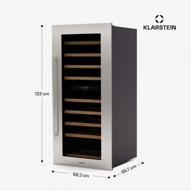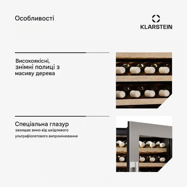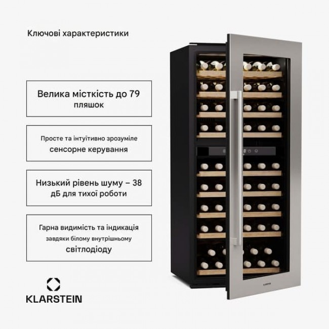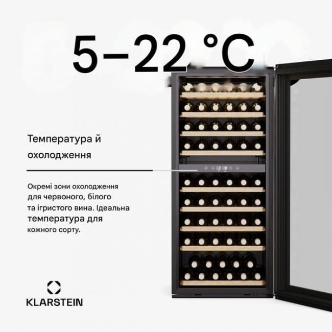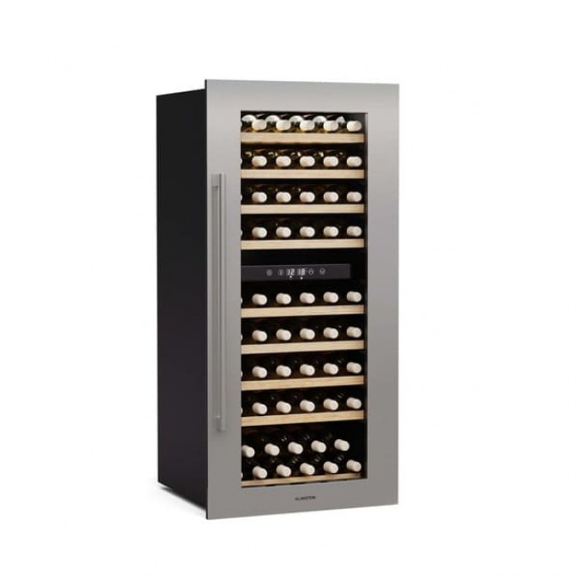 Винний холодильник Klarstein Vinsider Duo пропонує оптимальний комфорт зберігання вина завдяки двом окремим зонам охолодження та великій місткості до 79 пляшок.