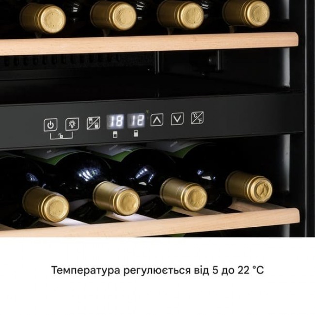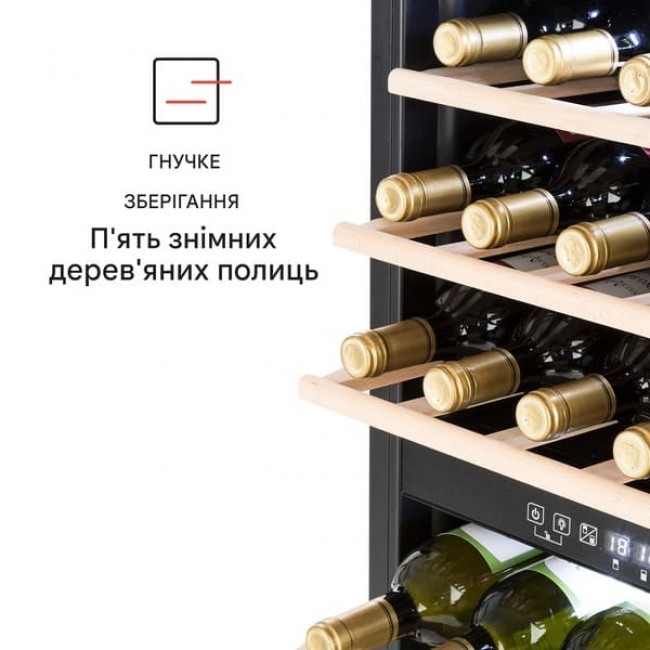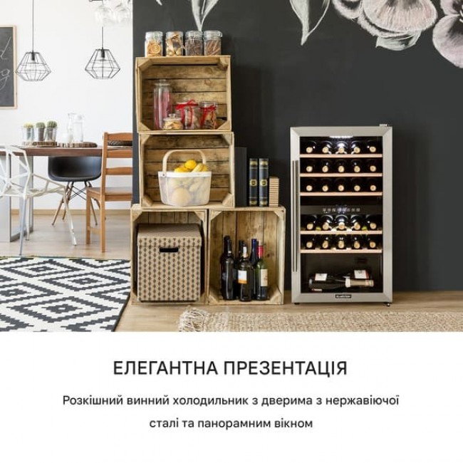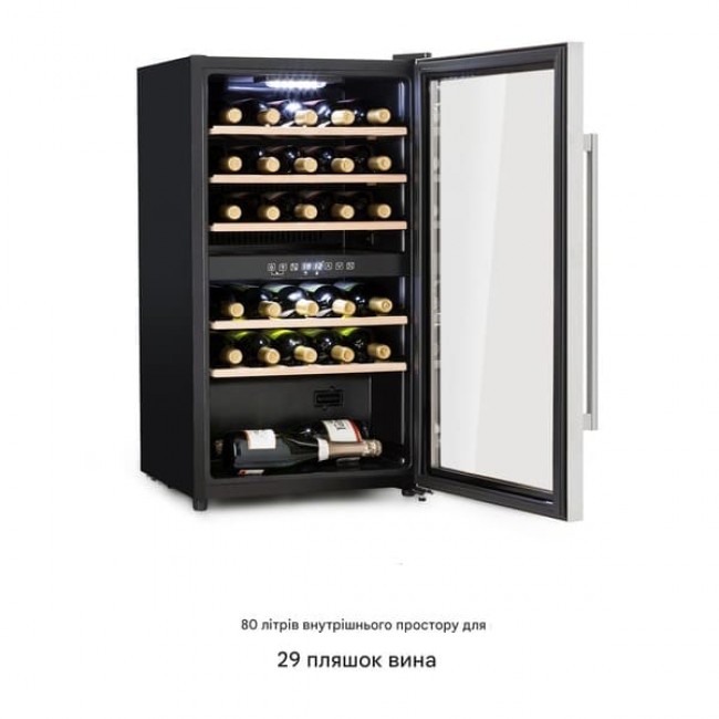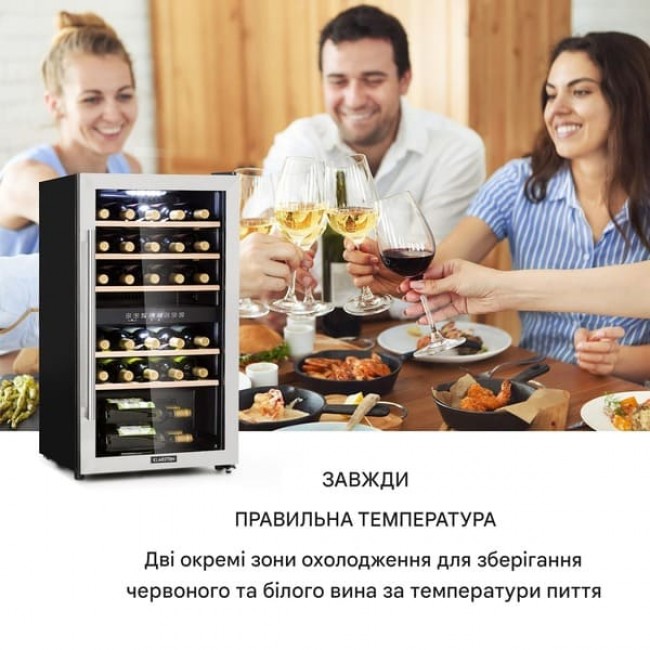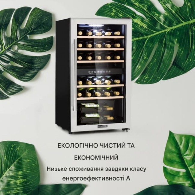 Винний холодильник Klarstein Vinamour 29 Duo може забезпечити найкращу насолоду від вина. Завдяки двом окремим зонам охолодження він одночасно може забезпечити потрібну температуру пиття для червоних і білих вин. Це створює розкішну атмосферу та представляє вишукані вина особливим чином - біле освітлення елегантно акцентує увагу на вині, що зберігається, і ви маєте чіткий огляд всього через панорамні скляні двері. 2-зонний винний холодильник чудовий для кожного любителя вина.
