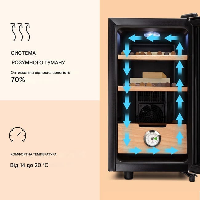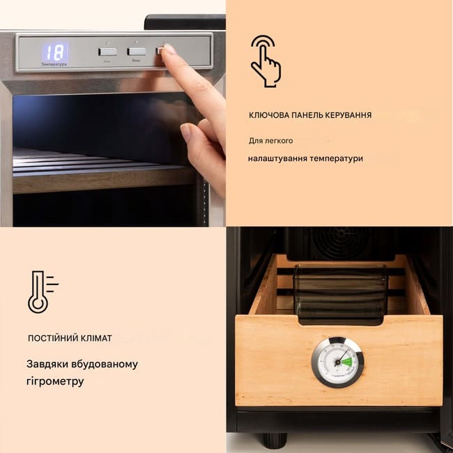 Керування здійснюється через сенсорну панель, а вбудований гігрометр спрощує контроль рівня вологості. Термоелектрична система охолодження забезпечує стабільну роботу без зайвого шуму.