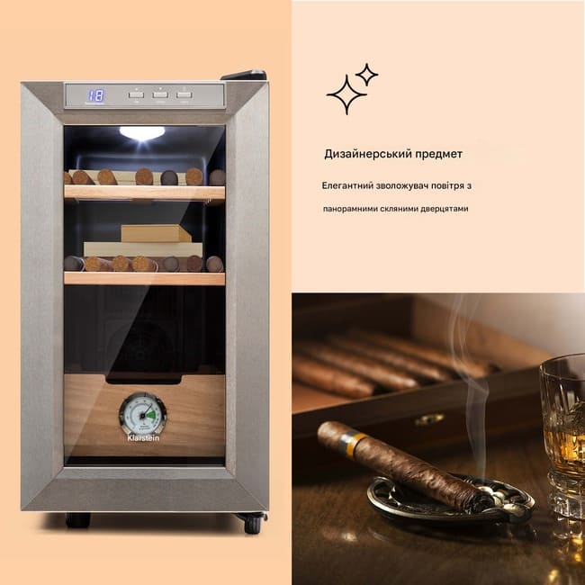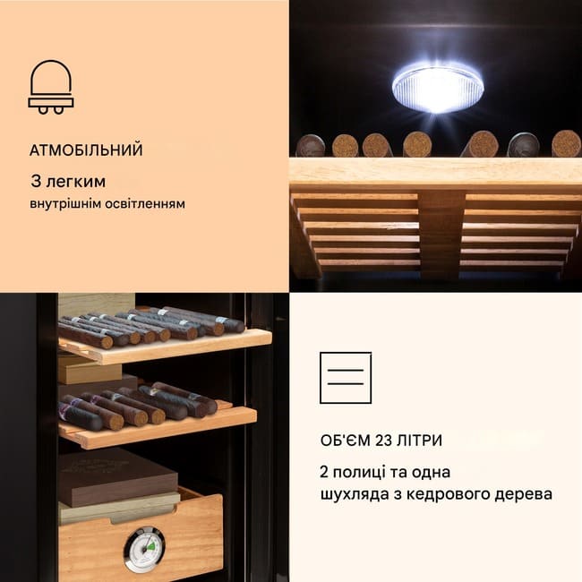 Камера об’ємом 23 л організована для зручного розміщення як окремих сигар, так і сигарних коробок. Усередині встановлено 2 полиці та 1 висувну шухляду з кедрового дерева — матеріалу, який традиційно використовується у х’юмідорах для делікатного зберігання та підтримання комфортних умов. Конструкція доповнена подвійним склом дверцят, внутрішнім освітленням і акуратними габаритами, завдяки чому модель доречна в барі, клубі або домашньому кабінеті.