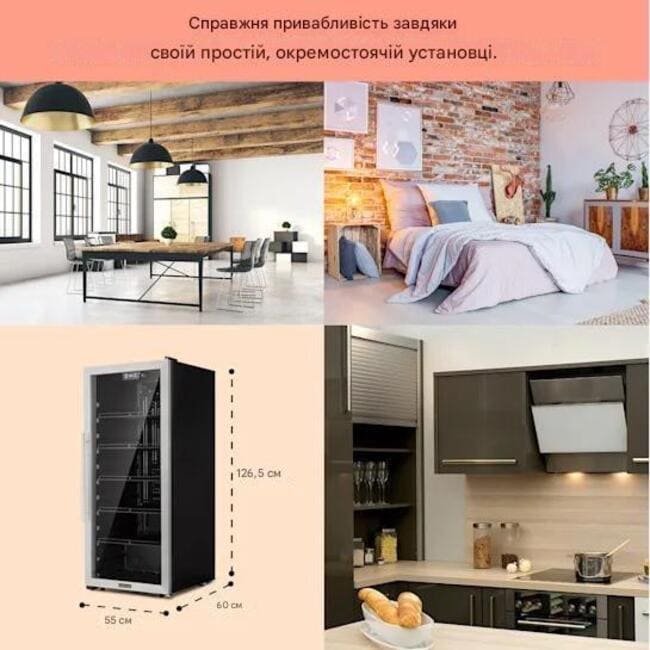 П'ять металевих сіток пропонують багато місця для всіх видів їжі та напоїв. Подвійні ізольовані панорамні скляні двері зберігають холод всередині та тепло зовні. Матовий фронт із неіржавкої сталі забезпечує гарний контраст із чорним інтер'єром. Додатковою подією є світлодіодне внутрішнє освітлення, яке надає Beersafe 7XL останній штрих. Температура охолодження може бути легко відрегульована за допомогою панелі керування з цифровим дисплеєм.