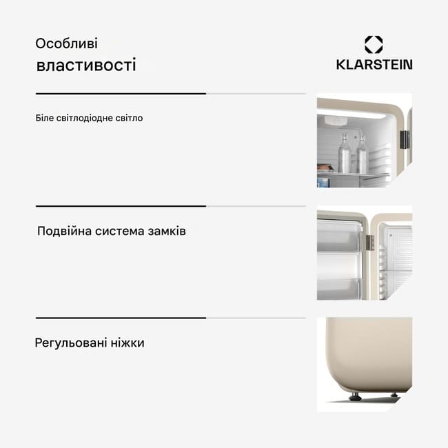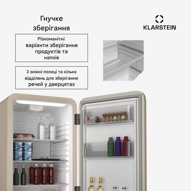 Вінтажний дизайн додасть нотку ностальгії будь-якому інтер’єру. Холодильник оснащений потужною компресорною системою охолодження та дозволяє точно регулювати температуру від 0 °C до 10 °C завдяки механічному термостату. Рівень шуму всього 40 дБ, що робить його достатньо тихим і комфортним у щоденному використанні.