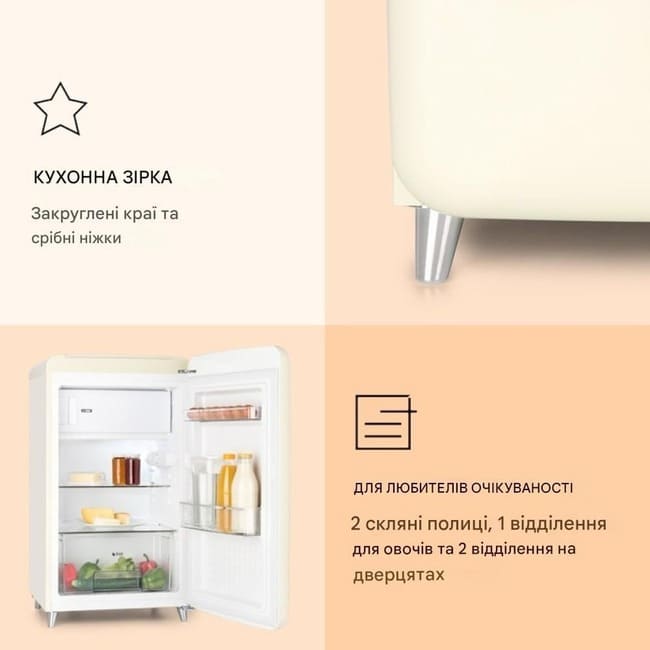 Свіжоохолоджені ласощі мають особливо хороший смак у стильному холодильнику Klarstein PopArt у ретро-стилі 50-х років! Окрім функціональності та економічності, він також приємний на вигляд завдяки своєму ніжному кольору. З об'ємом 118 літрів він має достатньо місця для ваших повсякденних продуктів, а також дозволяє красиво розмістити їжу та напої. Для цього ретро-холодильник PopArt пропонує вам 2 скляні полиці, 1 відділення для овочів, 2 відділення на дверцятах для пляшок та яєць, а також окреме морозильне відділення.