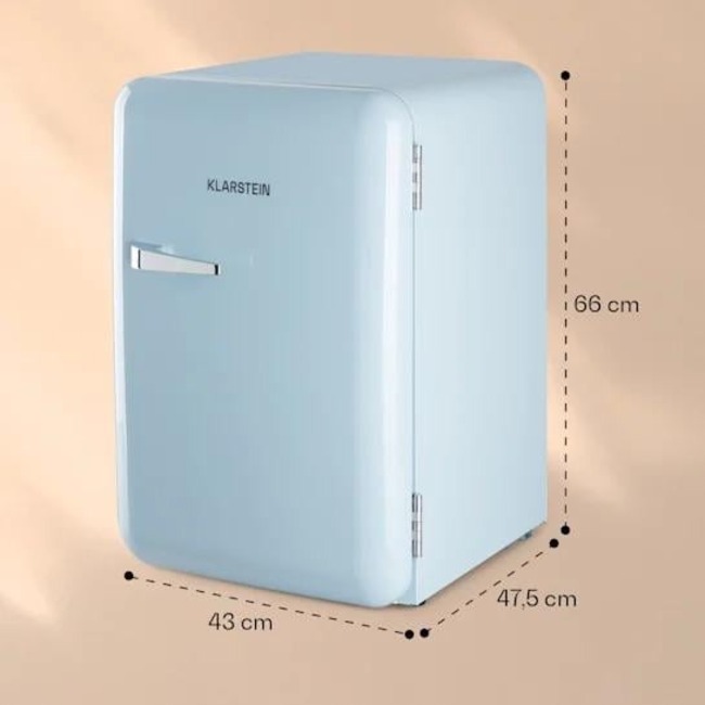 Ретро-холодильник Audrey 70 літрів 3 полиці 2 відділення у дверцятах Внутрішнє освітлення Барвистий і стильний холодильник Klarstein Audrey зробить ваш дім стильним. На кухні, в офісі або в гостьовій кімнаті: завдяки своїм компактним розмірам місткий Audrey можна використовувати де завгодно. Велика ручка спереду ідеально доповнює образ у стилі 50-х років. 70 літрів місця для зберігання пропонують багато місця, а 4 рівні з трьома регульованими дротяними полицями та 2 дверними відділеннями для пляшок, склянок і банок забезпечують лад. Завдяки внутрішньому освітленню у вас завжди буде огляд ваших страв, напоїв і закусок.