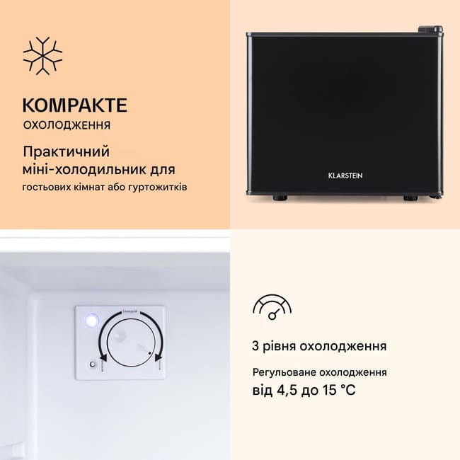 Холодне освіжання прямо у Вашому номері. Для всіх, хто любить прохолодні напої та закуски, у Klarstein є потрібний помічник із секретним міні-холодильником . Компактний розмір із 17 літрами охолоджувального простору на двох рівнях гарантує, що освіжаючі напої будуть під рукою в спальній кімнаті, кімнаті для гостей чи садовому сараї. І завдяки робочому шуму лише 26 дБ, він настільки тихий, що не заважає навіть спальням чи готельним номерах.