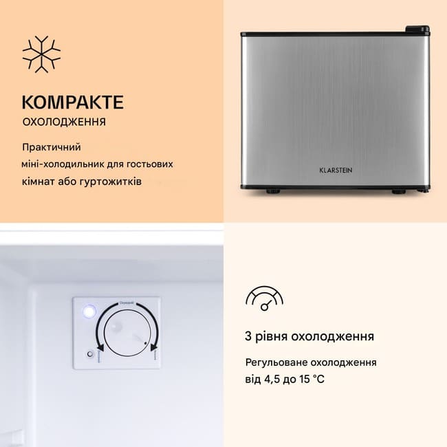 Прохолодні напої прямо у вашій кімнаті. Для тих, хто любить прохолодні напої та закуски, Klarstein має під рукою потрібний прилад із міні-холодильником Geheimversteck. У компактному охолоджувальному відділенні об’ємом 17 літрів він забезпечує освіжаючі напої на двох рівнях у студентському будинку, кімнаті для гостей або садовому сараї. І завдяки робочому шуму лише 26 дБ, його ледве чутно, тому він не викликає занепокоєння навіть у спальнях чи готельних номерах.