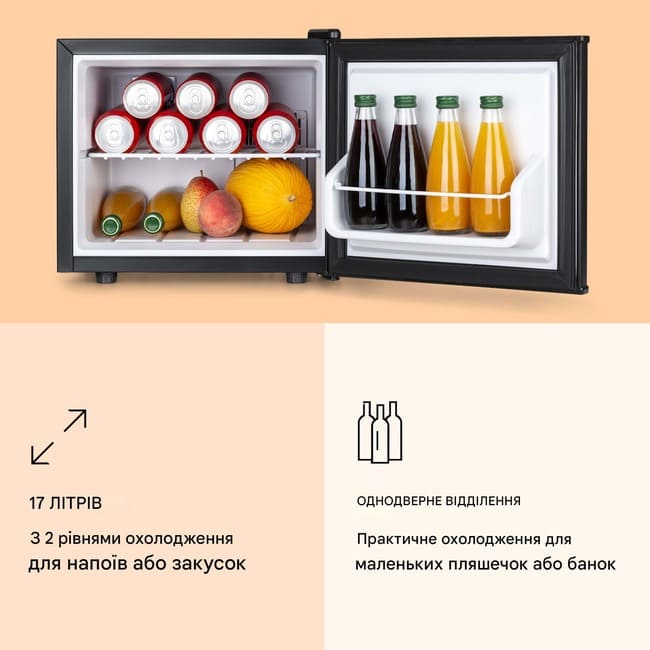 - 17 літрів: з 2 рівнями охолодження для напоїв і закусок
