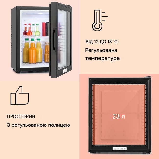 Компактні розміри та елегантний корпус зі скляними дверцятами роблять Klarstein MKS-12 ідеальним варіантом як стильний міні-бар у готельних номерах, хостелах та будинках відпочинку, а також як практичний кімнатний холодильник для студентських та окремих квартир.