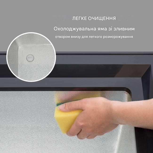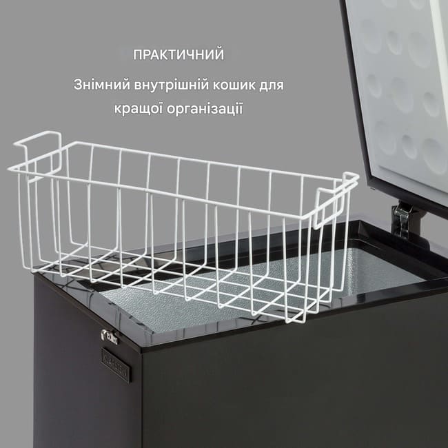 Внутрішній простір не поділений на секції, що дає змогу зберігати великі упаковки. Знімний підвісний кошик допомагає швидко організувати дрібні продукти та напівфабрикати.