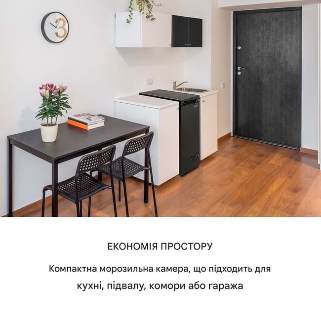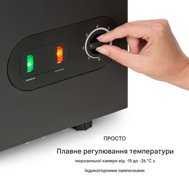 Сучасна морозильна скриня оснащена плавним поворотним регулятором температури з 7 ступенями налаштування. Діапазон від –15 до –26 °C дозволяє адаптувати роботу під різні типи продуктів. Пристрій здатний заморожувати до 3 кг за 24 години, зберігаючи смак і поживні властивості.