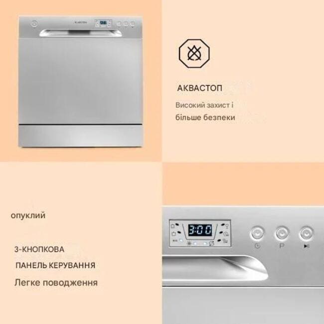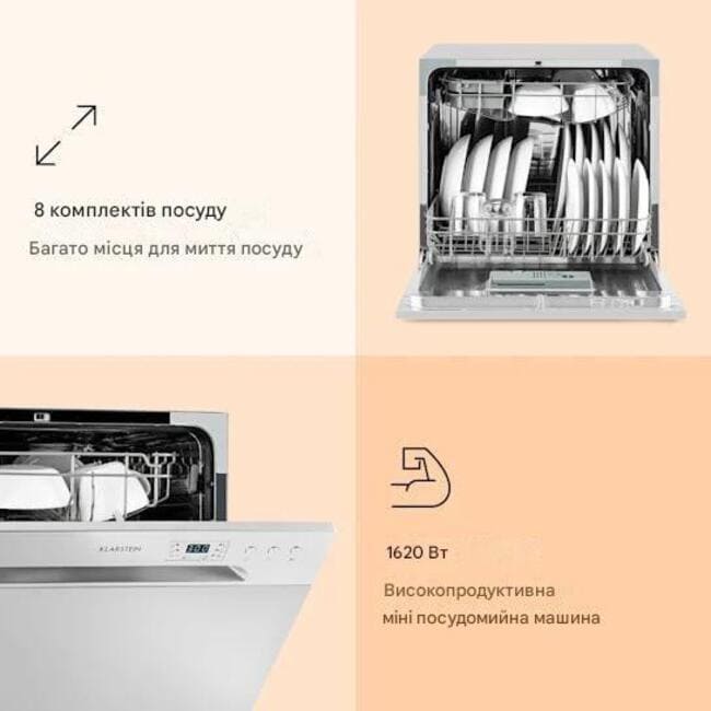 Кришталево прозорі склянки та посуд: посудомийна машина Klarstein Amazonia 8 надійно миє невеликий посуд. Має ідеальні розміри для одномісних кухонь, дачних квартир або котеджів! Майже непомітний завдяки своїм розмірам, він бере на себе миття посуду, а в сучасній міні-посудомийній машині можна одночасно розмістити до 8 комплектів посуду . За допомогою 3-кнопкової панелі керування ви можете вибрати одну з 6 корисних програм — саме так Amazonia 8 справляється навіть із сильним забрудненням, а завдяки своєму потужному дизайну вона справді привертає увагу на кухні.